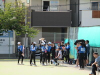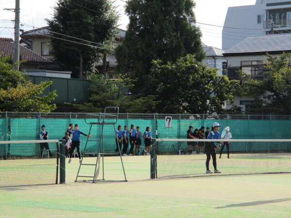 1回戦の相手は南浦和中。日差し厳しい浦和コートは、日陰もなく選手も応援する部員も先生方も体力を奪われます。そのような中でも元気いっぱい選手を応援する部員の姿は、本当に素晴らしかったです。応援のおかげもあり、一回戦は、1勝1敗で迎えた第3試合。接戦に次ぐ接戦。生き詰まる一進一退の攻防が繰り広げられます。あと1点に追い込まれても、焦ることなく力強い応援の後押しを受け、1点をもぎ取り、逆転する姿は感動でした。見事3試合目勝利し、まずは1勝となりました。しかし、1試合目がフルセットまでもつれ込んだ関係で、他の試合が先に終わっているため、連続して次の試合となりました。