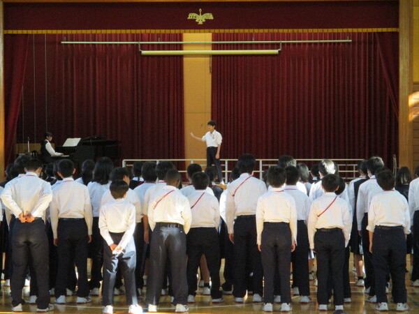 今年の合唱祭は、来週10月31日(金)、会場は市民会館いわつきにて行われます。本番まであと1週間とちょっと。本日より希望するクラスでは、8:00から朝の合唱練習が始まり、いつもより早い時間に多くの生徒たちが登校していました。6時間目は、1年生のリハーサル。今年から取り組んだ学年合唱、そして各クラスの合唱練習が体育館で行われました。1年生にとっては初めての中学校での合唱祭。クラスで生徒が主体となって練習を重ね、合唱祭では学年ごとに最優秀賞も決定します。自分たちの歌声だけでなく、他クラスの歌声にも真剣に耳を傾けている姿が印象的でした。本格的なコンサートホールでの西原中生の歌声が今から楽しみです。